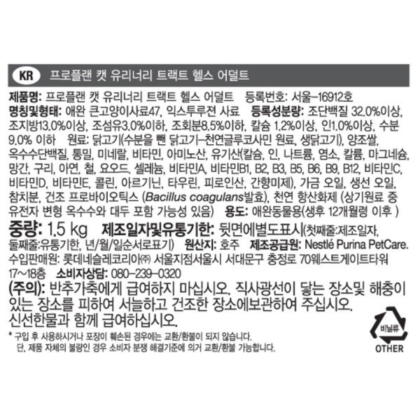 퓨리나 프로플랜 캣 사료 유리너리 비뇨기계 관리 1.5kg